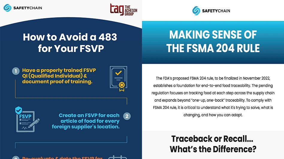 NOVATO, Calif. — SafetyChain has published two infographics that aim to provide summarized information about the Food and Drug Administration's (FDA) Food Safety Modernization Act's (FSMA) proposed 204 rule and how to avoid a 483 for your Foreign Supplier Verification Program.