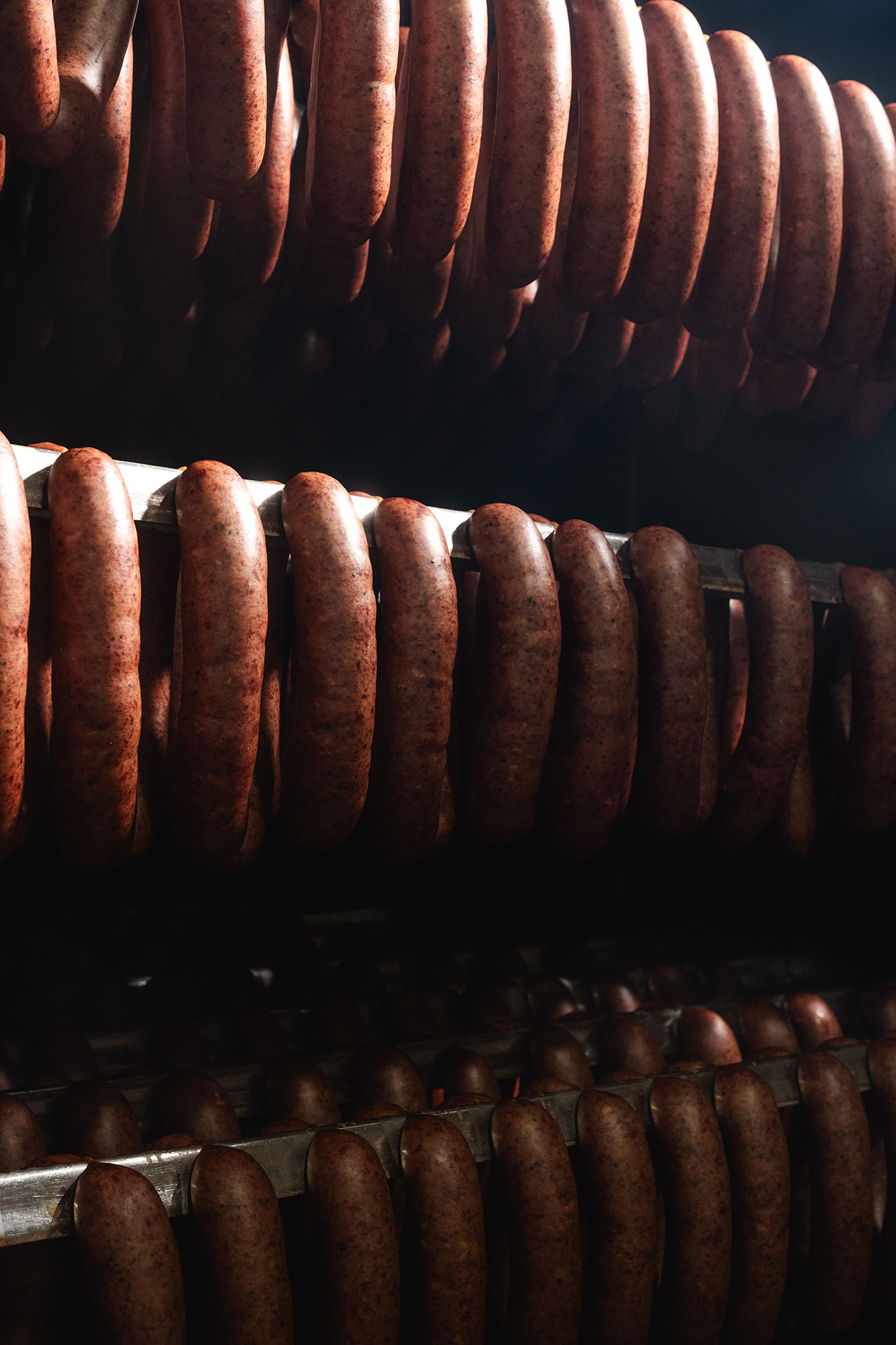 The trolleys roll forward into the smokehouse — the source of Kiolbassa’s signature flavor. A dense, savory haze of hickory smoke seeps into every link. Rows upon rows of sausage wait for their turn in the carefully controlled heat.