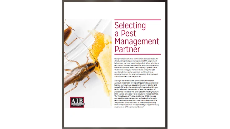 AIB International has published a free e-book on Selecting a Pest Management Partner, discussing the good business practice of hiring a pest control company to ensure a safe food product. The e-book includes factors to consider when deciding on exactly how a pest control company will meet your company's specific needs. From liability insurance to an annual assessment, it explains everything you need to know about selecting a pest management partner, the company said.