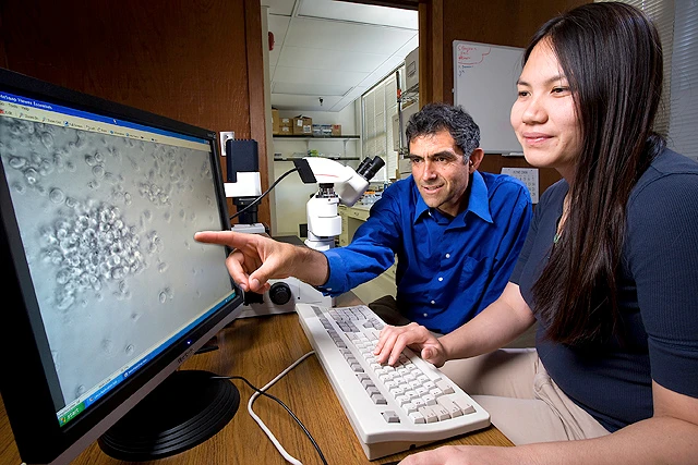 (Photo: ARS chemist Reuven Rasooly and bioscience technician Paula Do study foodborne toxins. Rasooly developed a test to detect staphylococcal enterotoxins in foods.)