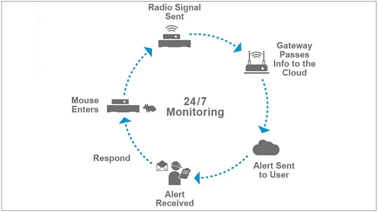 The Bayer Rodent Monitoring System uses sensors that allow each trap in a facility – often in numerous and otherwise hard-to-access locations – to be monitored 24/7.  Rodent captures trigger an immediate notification to the pest management company and/or facility management via e-mail or text message. Real-time graphic floorplans show the status of all monitor locations, so there is no lost time checking empty traps.  And up-to-the-minute reporting and trending from the system helps pest management companies review the effectiveness of trap placement schemes and optimize them to improve effectiveness of the rodent control program.