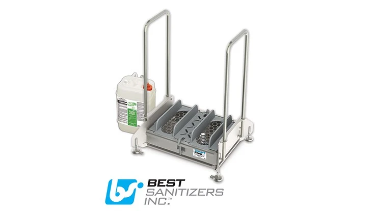The HACCP SmartStep2 Walk-Through Dual Footwear Sanitizing Unit is the newest addition to the family of Nevada City, Calif.-based Best Sanitizers’ HACCP Footwear Sanitizing Unit equipment. The HACCP SmartStep2 adds an additional layer of pathogen protection for food processing facilities, nutraceutical plants, pharmaceutical plants, clinical research labs, and clean rooms by reducing cross-contamination from footwear before employees enter the production area or other critical control zones. This foot-operated unit requires no electricity and uses compressed air to deliver an atomized spray of Alpet D2 Surface Sanitizer or Alpet D2 Quat-Free Surface Sanitizer to the bottom of footwear soles.
