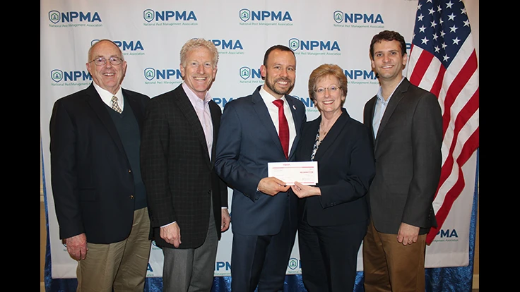 (Photo caption: Copesan check presentation to the NPMA Foundation. From left to right, Jim Sargent, Alfie Treleven, Jim Fredericks, Deni Naumann and Bennett Jordan.)