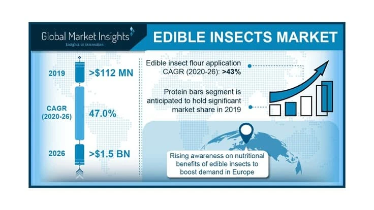 The edible insects market size exceeded USD 112 million, globally in 2019 and is estimated to grow at over 47% CAGR between 2019 and 2026, according to a new study from Global Market Insights..