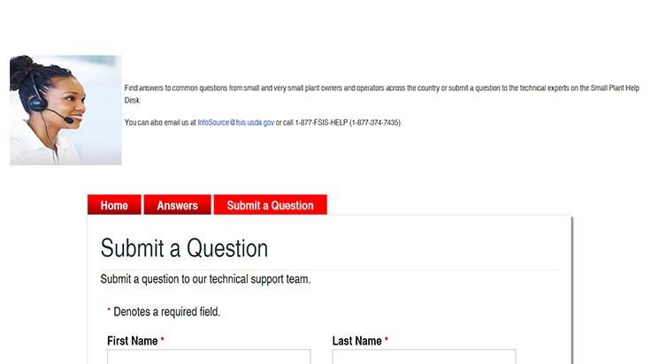 With more than 90% of the 6,389 FSIS-inspected plants considered small or very small operations, the Small Plant Help Desk provides useful information and technical assistance to more than 2,000 callers annually. The help desk consists of FSIS employees who are subject-matter experts with recent experience working in meat, poultry or processed egg facilities. The Small Plant Help Desk, as required by the 2008 Farm Bill, continues to serve as a "one-stop shop" for small plant owners and operators with valuable assistance. This virtual help desk addition will allow customers to receive information at all hours on any day of the week.