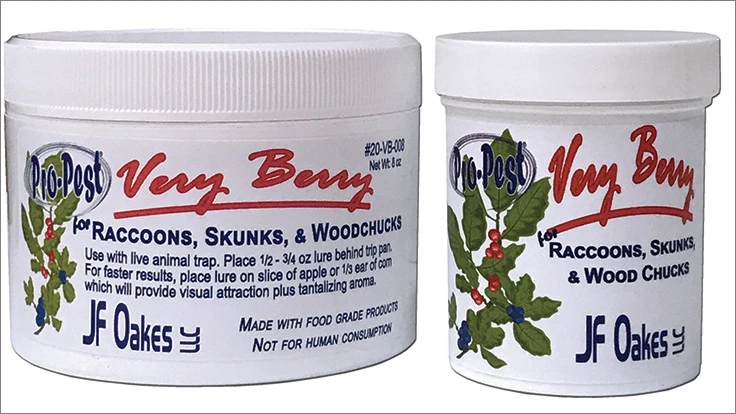 YAZOO CITY,  Ms. — J. F. Oakes announced it is offering an aromatic Pro-Pest Very Berry Lure for raccoons, skunks and woodchucks. The Pro-Pest Very Berry Wildlife Lure is a multi-animal lure made with all food grade products that is enticing and tantalizing, J. F. Oakes reports. It comes in in 4 and 8 ounce wide-mouth jar. Pro-Pest Very Berry Wildlife Lure is in stock and ready to ship, J.F. Oakes reports.