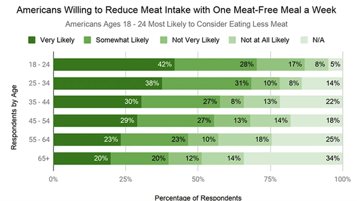 According to new research conducted by market research firm Dynata, on behalf of plant-based meat company Meatless Farm, 56% of Americans ages 18-65+ would consider reducing meat intake by one meal a week, while up to 24% of Americans are unlikely to eat any meals without meat.
