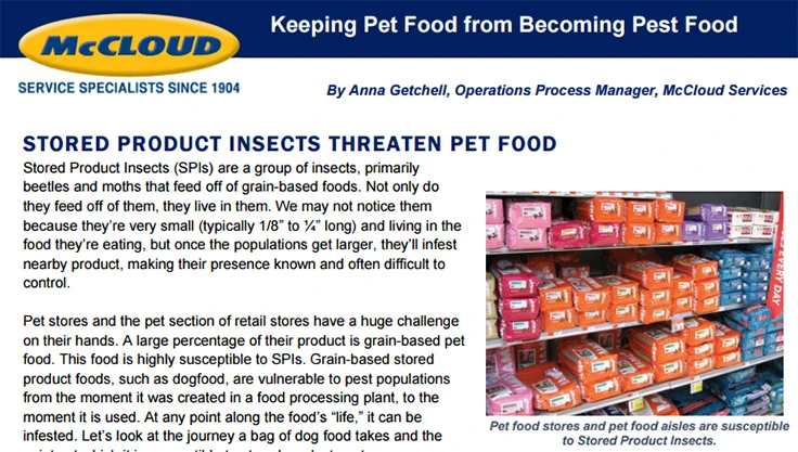 A new white paper from McCloud Services provides quality assurance professionals with tips for keeping pet food from becoming pest food. Written by Anna Getchell, operations process manager, McCloud Services, this guide describes the journey a bag of dog food takes and the points at which it is susceptible to stored product pests. The paper also reviews efforts that can be made along the path to mitigate that risk.