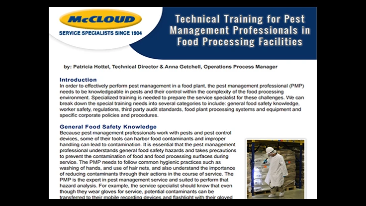 Because ongoing training and education for pest management professionals is critical to protecting a food facility, McCloud Services has developed a white paper, “Technical Training for Pest Management Professionals in Food Processing Facilities,” detailing special training needs and categories that are important for employee training including general food safety knowledge, worker safety regulations, third party audit standards, food plant processing systems and equipment, and specific corporate policies and procedures.