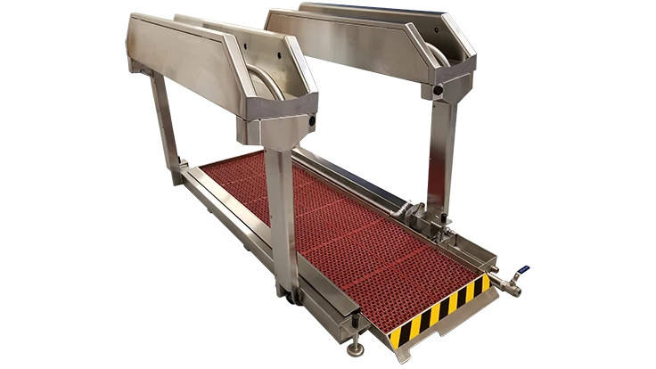 Hygienically engineered for easy maintenance and cleanability, the ergonomic walk-through design of the ProTech XV utilizes two hand-sanitizing troughs, each with sets of spray nozzles that apply a no-rinse quat sanitizer directly onto hands or gloved hands while employees are walking through the footwear sanitizing pan.