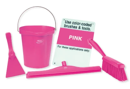 Color-coding tools, to assure that are used in the areas in which they are meant to be used, has helped stop bacterial migration between areas of the plant and different applications, the company said. New pink items for material handling are pails, shovels, scoops and scrapers. For janitorial and maintenance functions, squeegees, brushes, brooms, dust pans, signs and handles have been added.