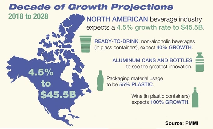 The beverage packaging and processing industry is experiencing major growth. According to the 2018 Beverage Trends in Packaging and Processing report and accompanying infographic, produced by the Association for Packaging and Processing Technologies (PMMI), the North American beverage industry is expected to grow 4.5% to $45.5 billion in the next 10 years.