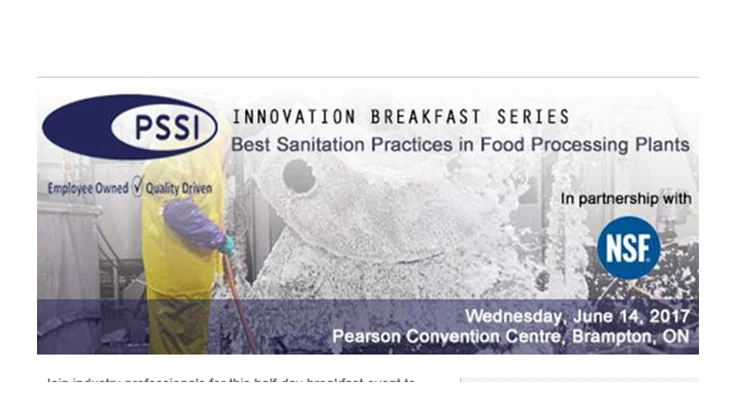 Join industry professionals for a half-day breakfast event to learn about the best sanitation practices for processing plants. Sessions will be delivered by PSSI Sanitation Inc. and NSF International's technical experts who will cover best practices in sanitary maintenance needed to guard facilities against a food safety crisis.