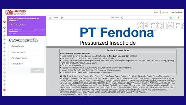 CLEVELAND, Ohio — PCT’s Distance Learning Center continues to expand with the addition of BASF's PT Fendona Pressurized Insecticide. Visit https://training.pctonline.com or PestWeb's ProTraining website and get started on the module.This and other label training modules are the centerpiece of PCT’s Distance Learning Center — a FREE service for the professional pest control market provided by PCT.