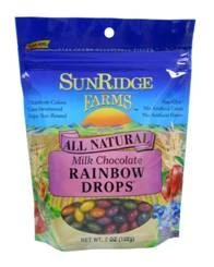 In response to increasing consumer demand for better-for-you candies, SunRidge Farms is expanding its natural candy line to include all natural Milk Chocolate Rainbow Drops. Packed in SunRidge Farms solar powered facility, the new addition features natural premium quality chocolate with real vanilla in a cane sugar shell. Rainbow drops come in seven colors each derived from vegetable juice, rather than food dye and titanium dioxide.