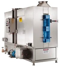 This vertical-load machine is only 10 feet long and washes and sanitizes at the rate of 120 pieces an hour, the company said. Wash water is re-circulated to save water and chemicals. After the pallet leaves the wash chamber, it is sprayed with a fresh water sanitizing rinse at 180 degrees. An optional blow-off module also is available.