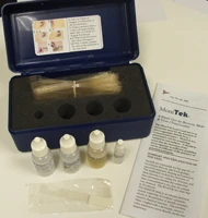 Simply moisten the test strip with the buffer provided and wipe the surface in question with the test strip. Add a drop of the second fluid to the test strip and set aside for 20 minutes. Next, add a drop of the third fluid and look for a color change. If the area tested has bacterial contamination present, a purple coloration will appear on the test strip. The MoniTek kit supplies enough material to conduct 50 tests.