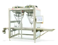 The Paloma-D2 is available with up to three arms. Depending on model and the product, the Delta Robot allows a pick and place movement of up to 240 products per minute. With additional corresponding end-effectors, the standard 3-axis arms can be extended to a fourth movement axis. This is necessary if the robot has to rotate the product before placing or if it needs to place several products into tight trays and packages. A vision control system ensures that even misaligned products can be exactly picked and placed into secondary packaging. Thus there is no need for any additional intermediate infeed process.